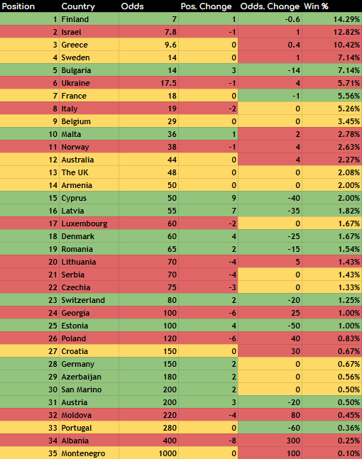 What currently seems the biggest development of the week was Leleka’s comfortable win in Vidbir with market and fan favourite Jerry Heil finishing in 3rd. There’s been a small drift in the market but an acknowledgement even from the most pessimistic Ukraine will be somewhere in the top 10 and a danger higher up.